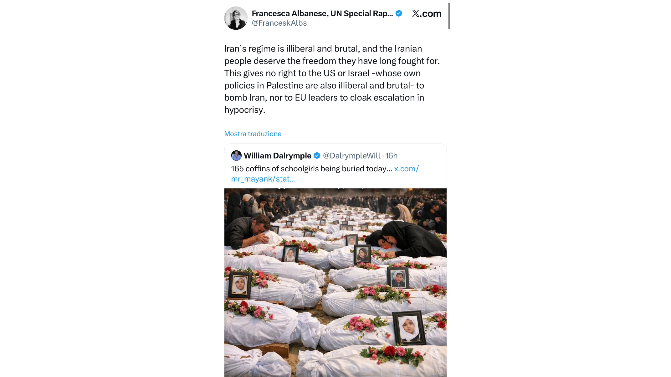 L’ultimo episodio che coinvolge Francesca Albanese, Relatrice Speciale delle Nazioni Unite, solleva interrogativi inquietanti sulla credibilità delle istituzioni internazionali e sulla natura della guerra informativa contro lo Stato di Israele. In un post pubblicato sui social media, Albanese ha rilanciato un contenuto originariamente diffuso dallo storico William Dalrymple, il quale mostrava file interminabili di feretri avvolti in lenzuoli bianchi, ornati di fiori e fotografie di bambine. La didascalia recitava: “165 feretri di scolare sepolte oggi”. Dietro questa immagine però c’è un algoritmo di intelligenza artificiale al servizio della propaganda iraniana.